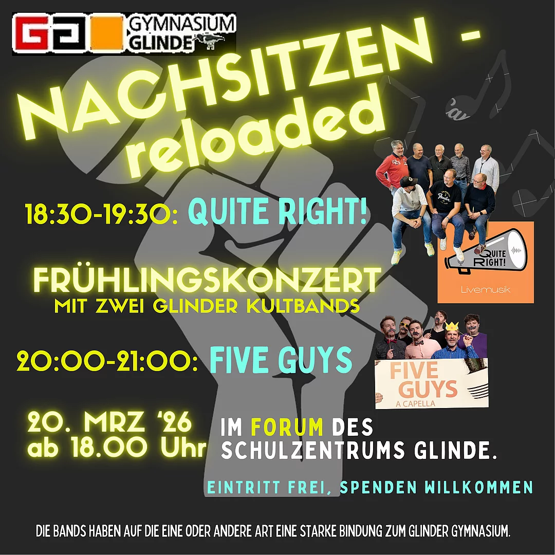 Beide Bands sind aus Ehemaligen und Lehrkräften mit direktem Bezug zum Gymnasium Glinde entstanden, haben eine starke Bindung zur Schule und freuen sich auf einen erneuten gemeinsamen Auftritt. QuiteRight! spielt Classic-Rock und Pop, die FiveGuys unterhalten a capella mit feinem Wortwitz.