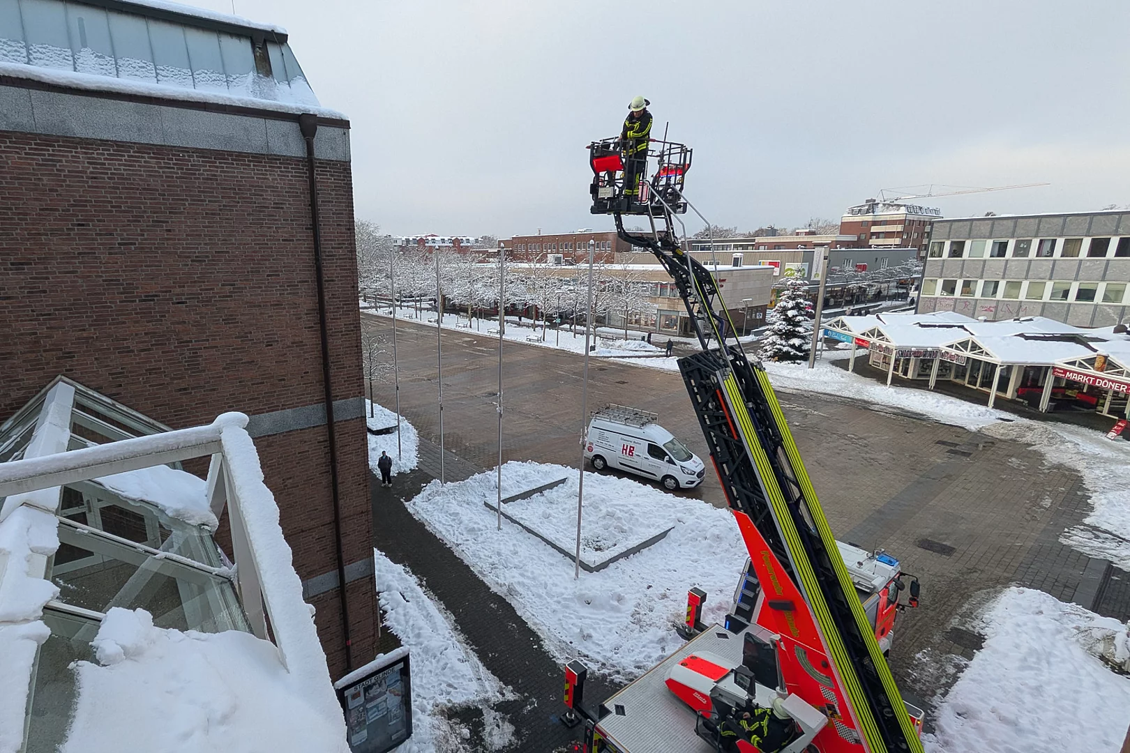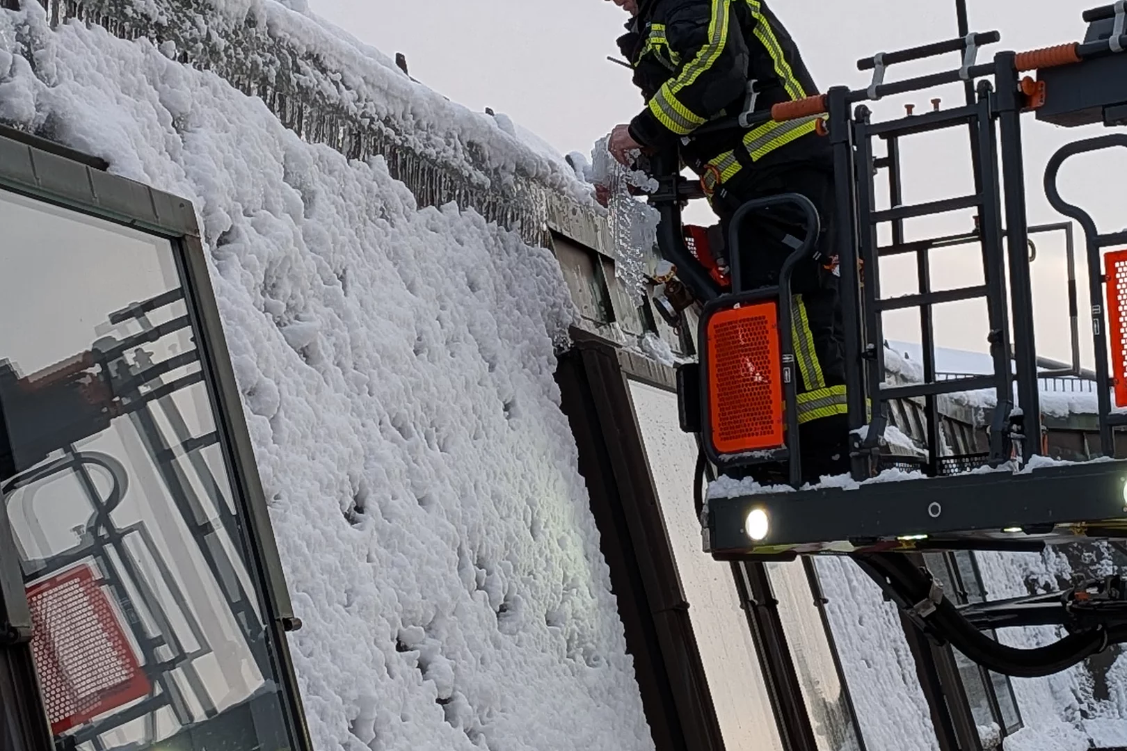 An Dachkanten bilden sich teilweise schon Eiszapfen. Diese können plötzlich abbrechen und abstürzen. Gleiches gilt für Dachlawinen. Schnee kommt an eigen Stellen ins Rutschen und fällt unvermittelt runter. Damit rund um das Rathaus niemand verletzt wird, war heute (06.01.2026) die Freiwillige Feuerwehr Glinde mit der Drehleiter aktiv. Eisplatten am Dach und Schnee wurden entfernt. Passantinnen und Passanten sollten sich im Stadtgebiet auf diese Situation einstellen. Hauseigentümerinnen und -tümer müssen Gefahrenbereiche absperren.