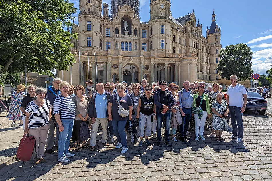 Am Donnerstag, den 10. Juli, führte die Gruppe ein Busausflug nach Schwerin. Da viele Gäste bereits mehrfach in Glinde waren, sollte eine besondere Stadt in der Umgebung entdeckt werden. Auf der Fahrt waren die deutschen Gastgeber in rege Gespräche mit den französischen Gästen vertieft, meist auf Französisch. Deutsche Neulinge der Gruppe versuchten sich mit den letzten vorhandenen Sprachkenntnissen aus der Schule oder Auffrischungskursen in eine Unterhaltung zu begeben. Am Zippendorfer Strand gab es ein kurzes Franzbrötchen-Frühstück (mit freundlicher Unterstützung von Junge – Die Bäckerei) mit Blick auf den Schweriner Innensee. Es folgte eine Besichtigung des Schweriner Schlosses – staunende Blicke und interessierte Fragen inklusive. Auch beim Stadtspaziergang wurde die Landeshauptstadt Mecklenburg-Vorpommerns bewundert.