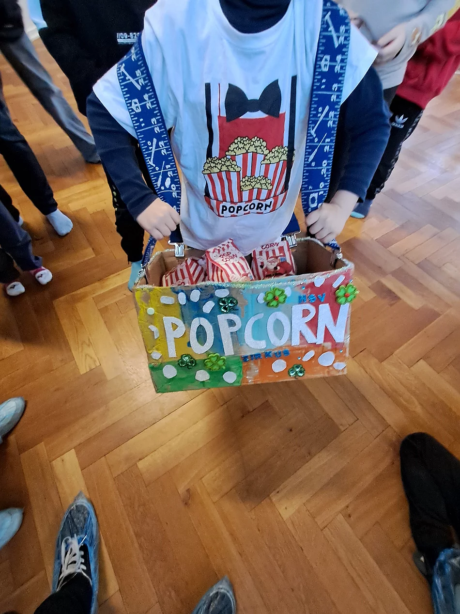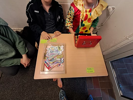 Die Kinder gingen also zusammen mit dem Fachpersonal auf die Suche nach Material, das man verwenden kann. Anschließend haben sich die Kinder Übungen und Attraktionen überlegt, die in einer Zirkusaufführung vorkommen und haben angefangen diese einzuüben. Außerdem wurden Eintrittskarten und Bauchläden zum Verkauf von Popcorn und Süßigkeiten gebastelt.
