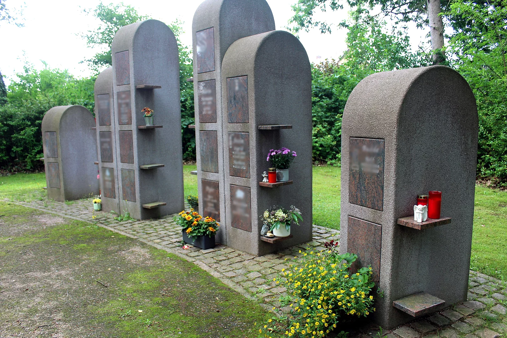 Weitere Grabarten für Urnen ohne Pflegeaufwand sind die Urnenstelen und die Urnengemeinschaftsgrabanlage. Bei den Urnenstelen stehen für die Beisetzung von zwei Urnen sogenannte Urnenkammern zur Verfügung. Die Verschlussplatte kann individuell graviert werden und für die Ablage von Grabschmuck sind seitlich an den Stelen Ablageplatten angebracht. Die Laufzeit beträgt 25 Jahre und kann verlängert werden.