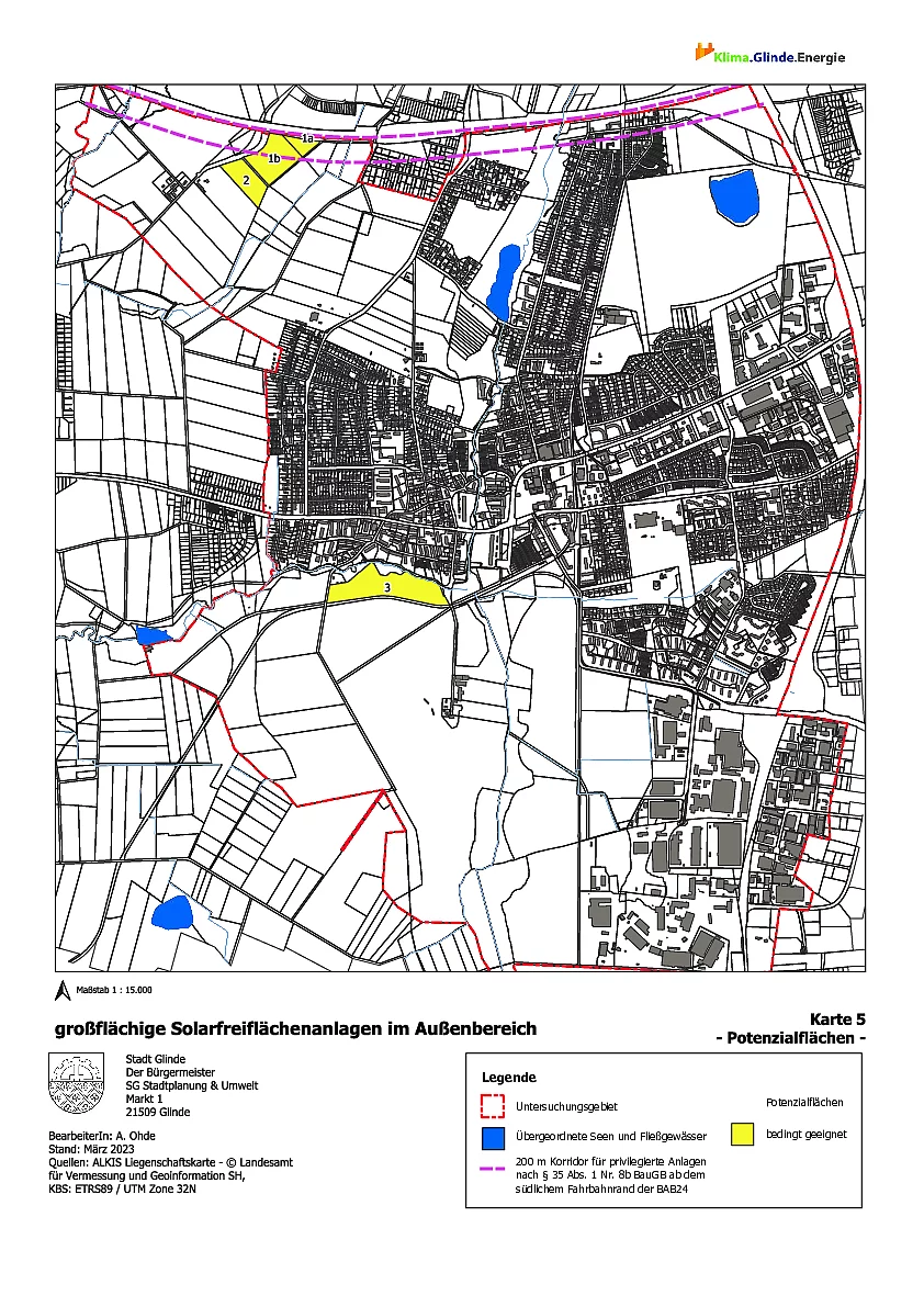 Die Stadt Glinde hat sich bereits im Rahmen ihres Integrierten Klimaschutzkonzeptes mit der möglichen Ansiedlung von großflächigen Photovoltaikanlagen innerhalb des Stadtgebietes überschlägig beschäftigt. Um den Anteil an erneuerbaren Energien zu erhöhen und dem Bau von Photovoltaik-Freiflächenanlagen nachzukommen, hat die Stadt Glinde ein informelles Rahmenkonzept zur Potenzialflächensuche aufgestellt. Der vorliegende Endbericht zeigt das Ergebnis der Untersuchung und beschreibt dabei die Vorgehensweise, wie die möglichen Potenzialflächen ermittelt wurden.