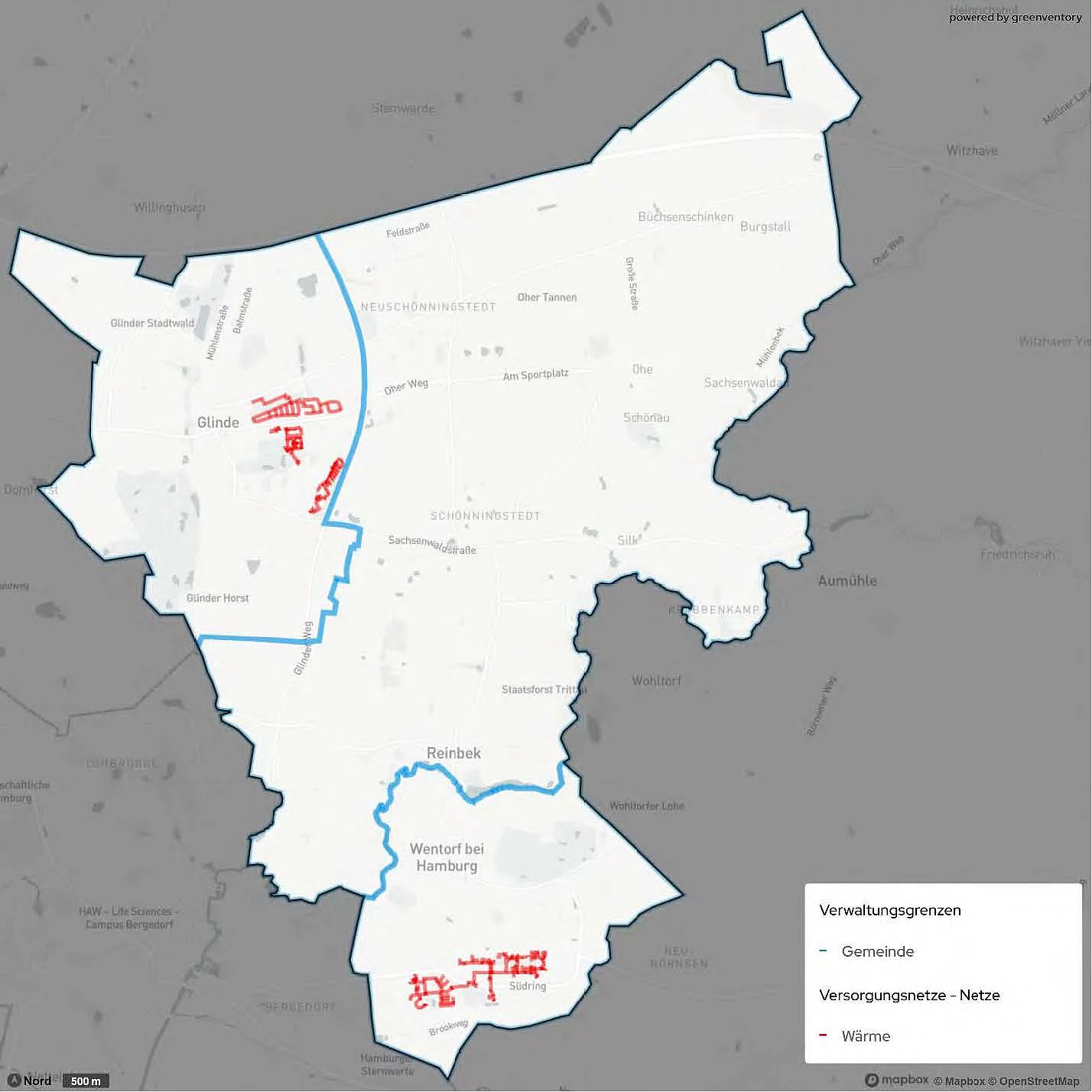 - Der Rest des blauen Gebiets ist in der Kommunalen Wärmeplanung als Eignungsgebiet für Wärmenetze definiert. Dies bedeutet, dass dort Netze vorstellbar wären, derzeit (Stand 01/2026) aber weder in Bau noch in unmittelbarer Planung sind.