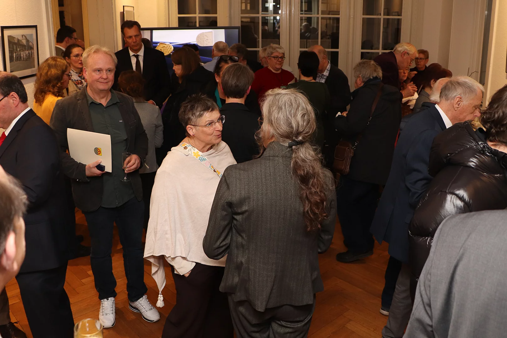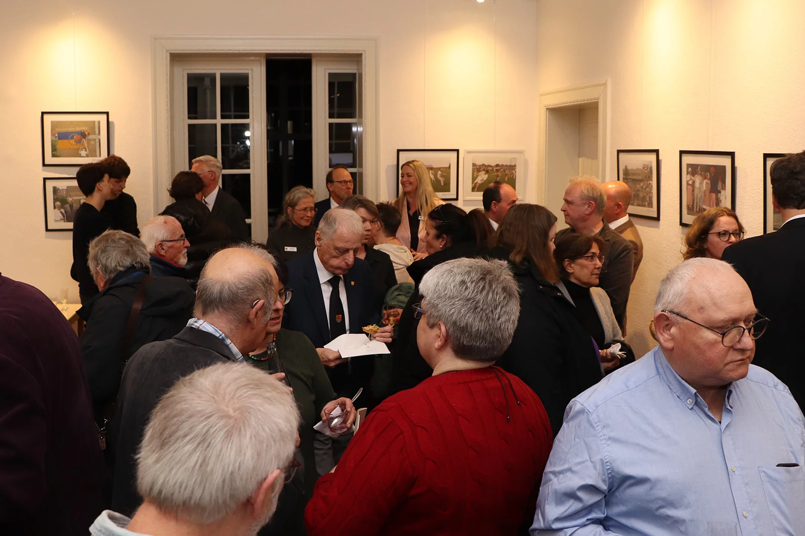 Viele Menschen sind in Gesprächen bei einem Empfang.